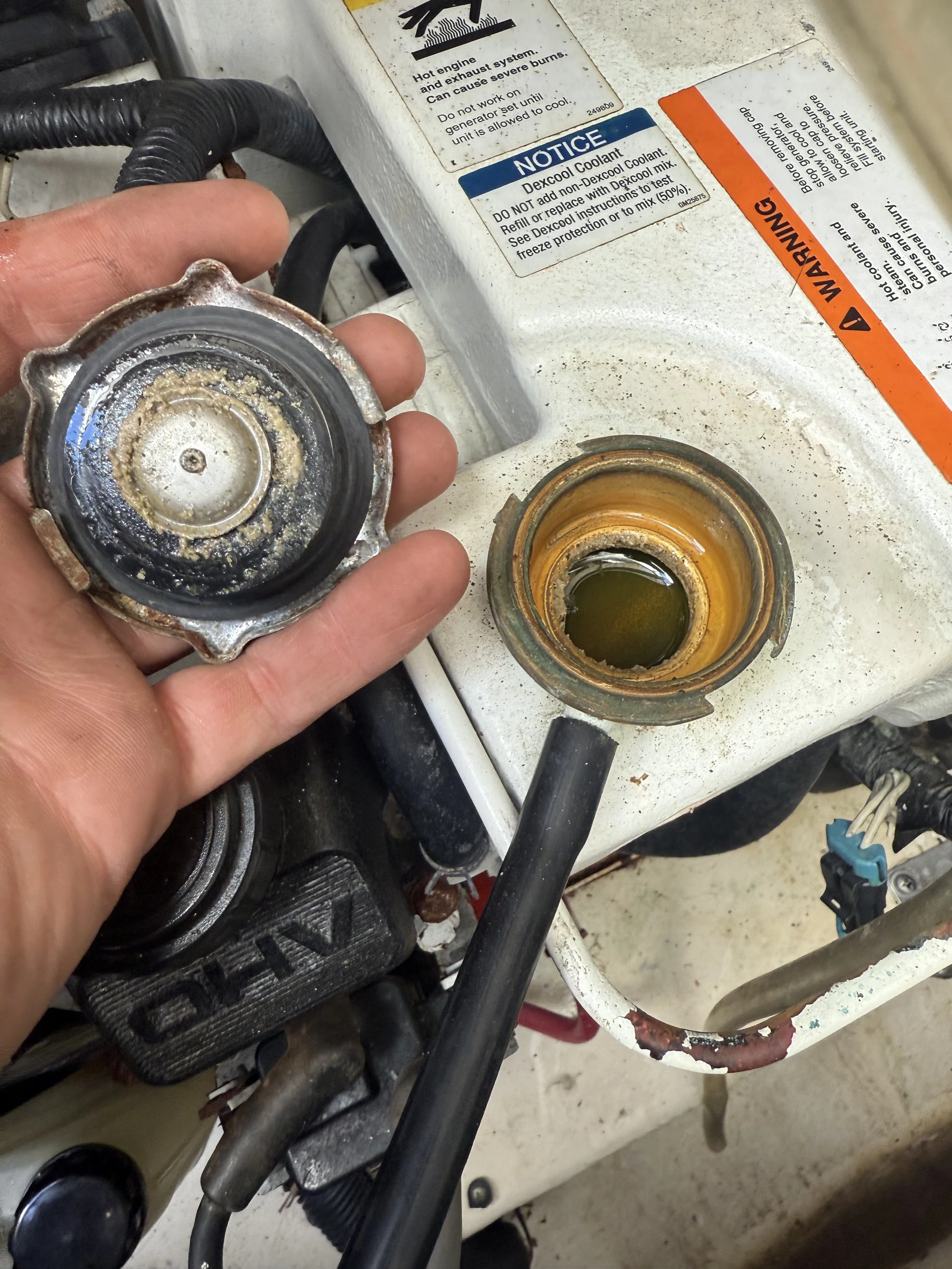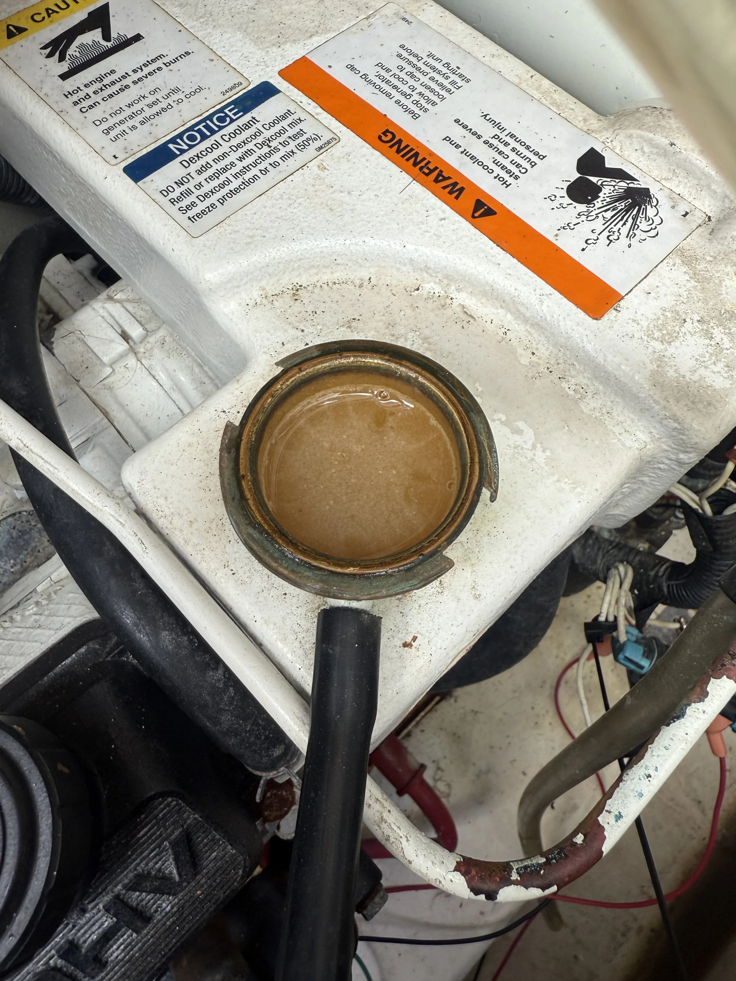 These photos are of a Kohler generator that has a heat exchanger that has failed. We know this because it is evident that saltwater is mixed with the coolant. On the coolant cap we have clear signs of calcium. The coolant has also lost it’s color. And when we start the generator the cooling system foams up immediately and starts to overflow, indicating that the sea water pump is pumping water into the fresh water cooling system.